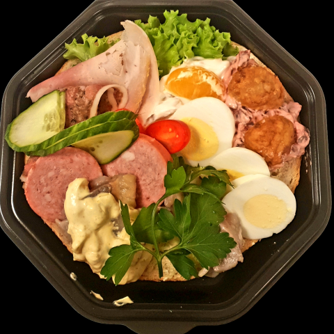 Bröd, mimosasallad, mandarinklyfta, julskinka, senap, pressylta, medvurst, ägg, skagenröra, räkor, sill, rödbetssallad, köttbullar.